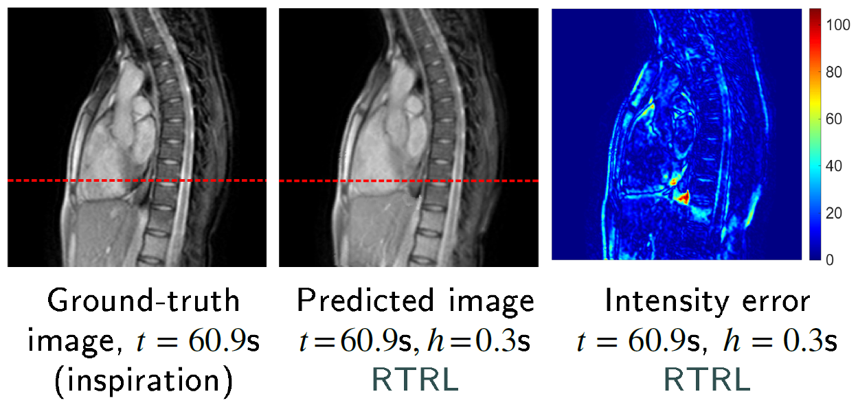I designed an algorithm to forecast future frames in dynamic chest and liver MR images, based on motion modeling with PCA and temporal dynamics prediction with RNNs trained online and transformer encoders, for safe MR-guided radiotherapy. The proposed approach is modular, interpretable, and can help overcome data scarcity, motion irregularity, and distributional shift between the training and test datasets for population models.